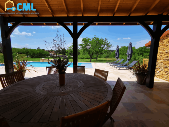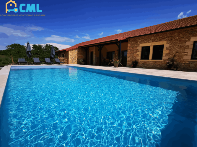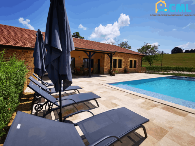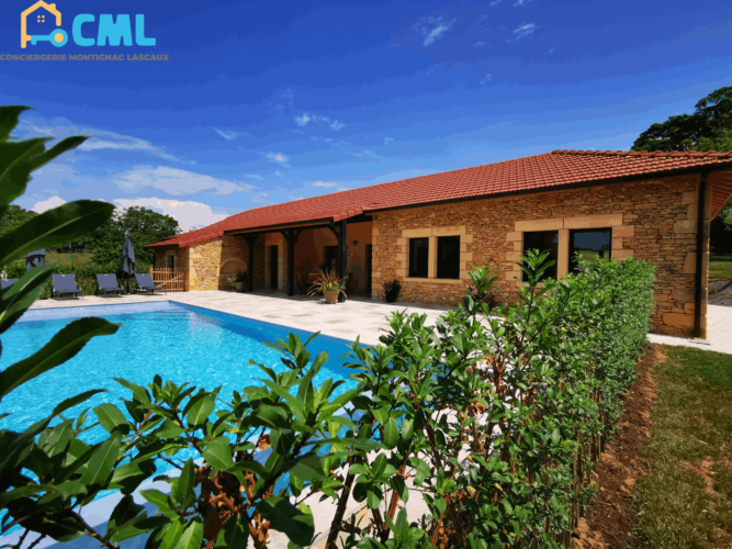 Maison de vacances de plein pied avec piscine privée idéalement située entre Montignac Lascaux et Sarlat. Vous souhaitez découvrir la vallée de la Vézère (Lascaux) et ses innombrables sites préhistoriques ou la vallée de la Dordogne (Sarlat), ses 1001 châteaux, cette villa est faite pour vous !! La construction de cette maison s’est terminée en Mai 2023. Tout à été soigneusement pensé pour un confort optimal. Une piscine 10 x4 m privée sécurisée par un volet roulant, une terrasse de 80m² avec salon de jardin, barbecue, bains de soleil. La maison est composée de 4 chambres et 4 salles d’eau, une , maison entièrement climatisée. Les salles d’eau sont systématiquement équipées, d’un meuble vasque, douche italienne, et WC. Vaste salon séjour, cuisine américaine avec accès terrasse. TV + wifi disponible. La maison entièrement climatisée.Détails