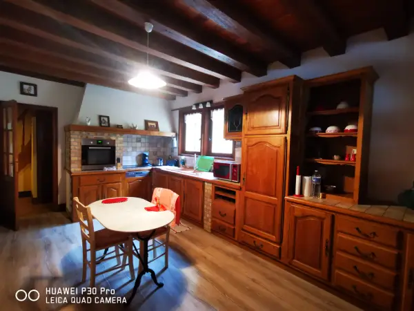 se trouve un vaste salon / séjour de 40m², 2 chambres (l’une équipée d’un lit 140×190 cm, l’autre de 2 lits 90×190), une salle de bain et WC. La cuisine est parfaitement équipée, four traditionnel, plaque vitro céramique, régrigérateur/freezer, cafetière senseo, grille pain …. A ce niveau se trouve également une superbe terrasse abritée, agrémentée du barbecue, table à manger, micro-ondes, point d’eau..