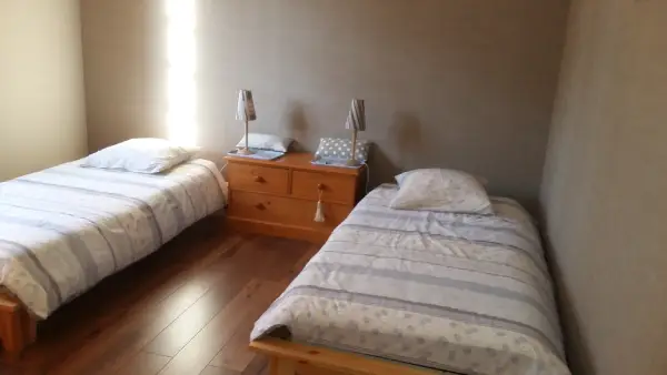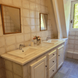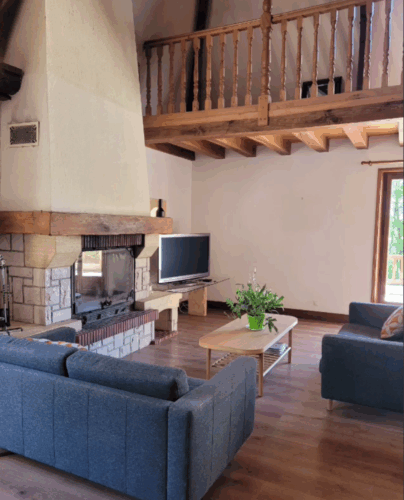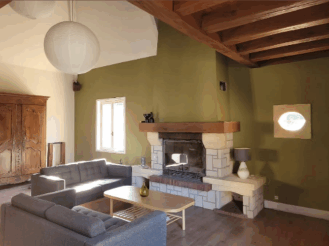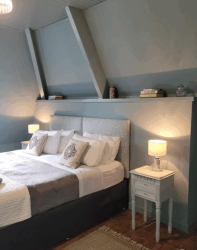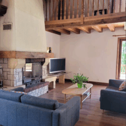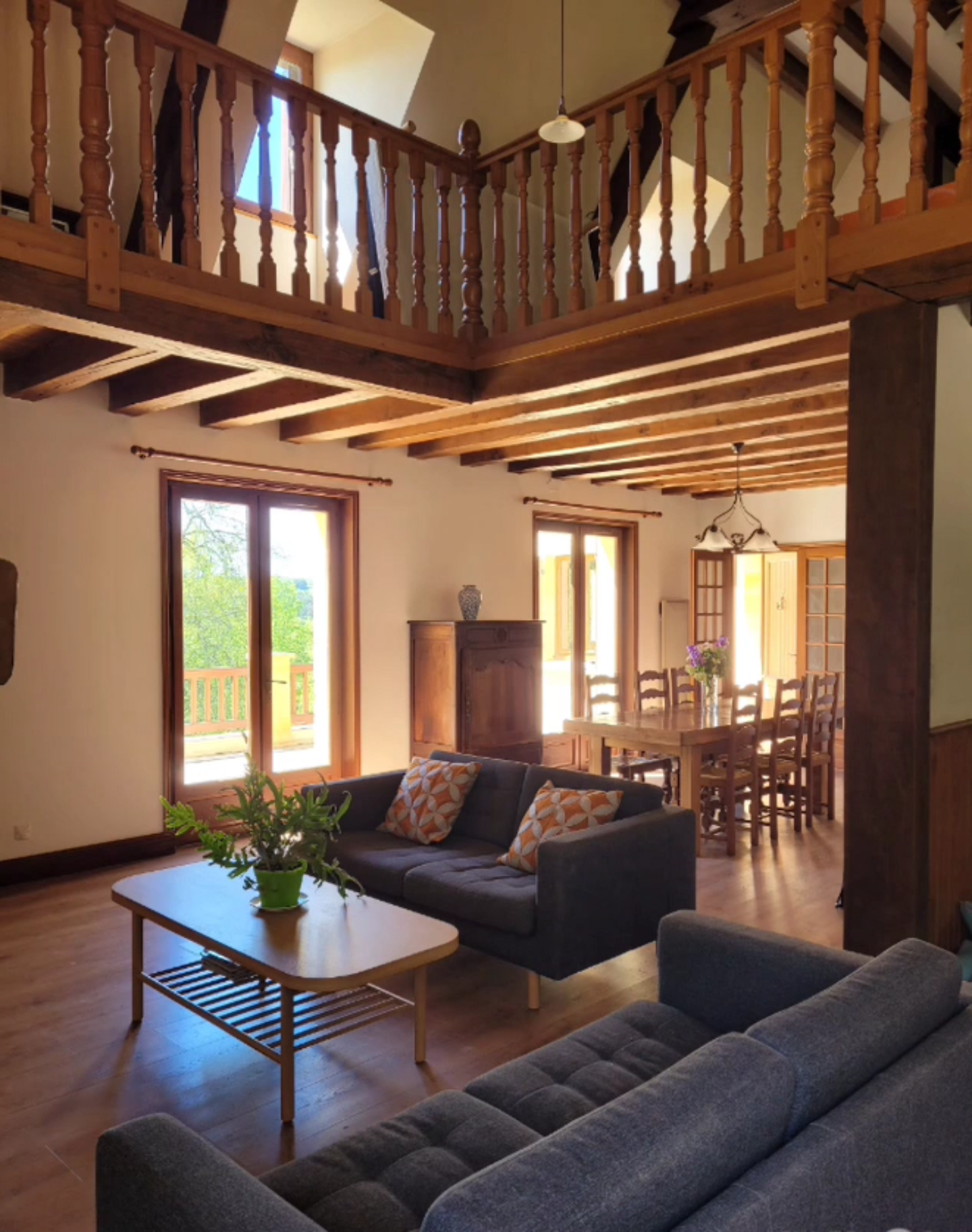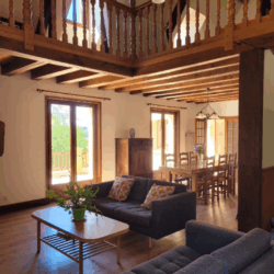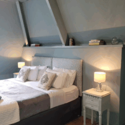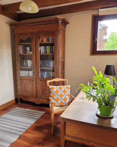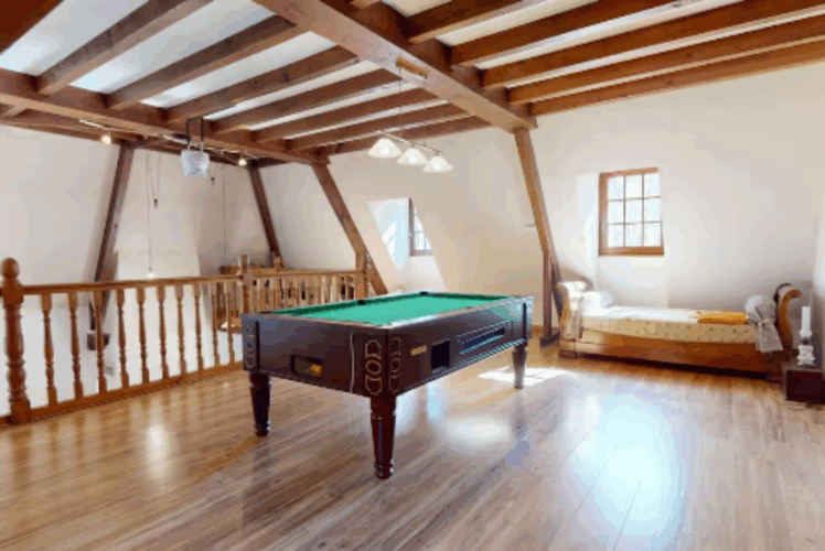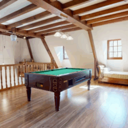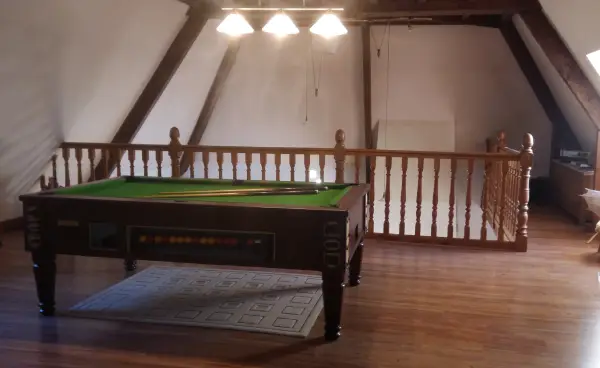 en haut de l’escalier, se trouve la mezzanine qui accueille un espace billard !! 2 chambres (l’une équipée d’un lit 140×190 cm, l’autre de 2 lits 90×190) et 1 salle d’eau complètent ce palier, avec des espaces détentes, lecture et un bureau. TV et Wifi.